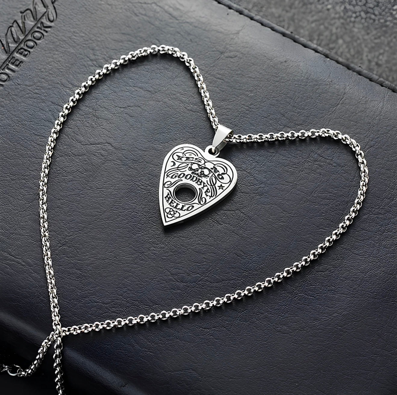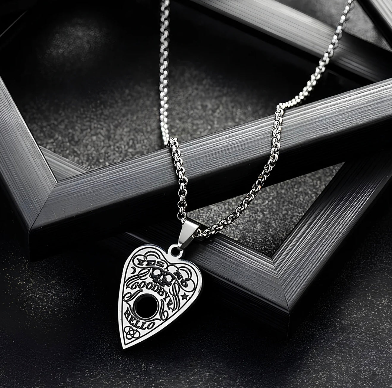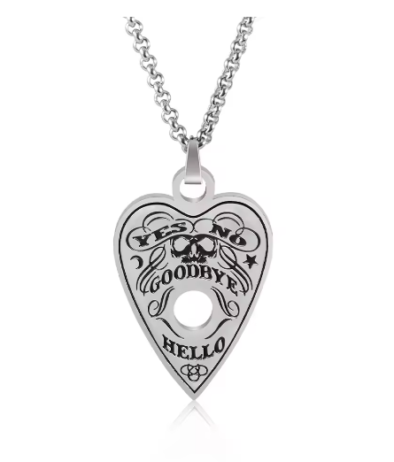 Summoned from the quiet between worlds, this Ouija Planchette Necklace hangs like a whispered question against your skin. Etched with symbols of the unseen, it carries the echo of forgotten voices — the ones that linger after midnight when the veil grows thin.